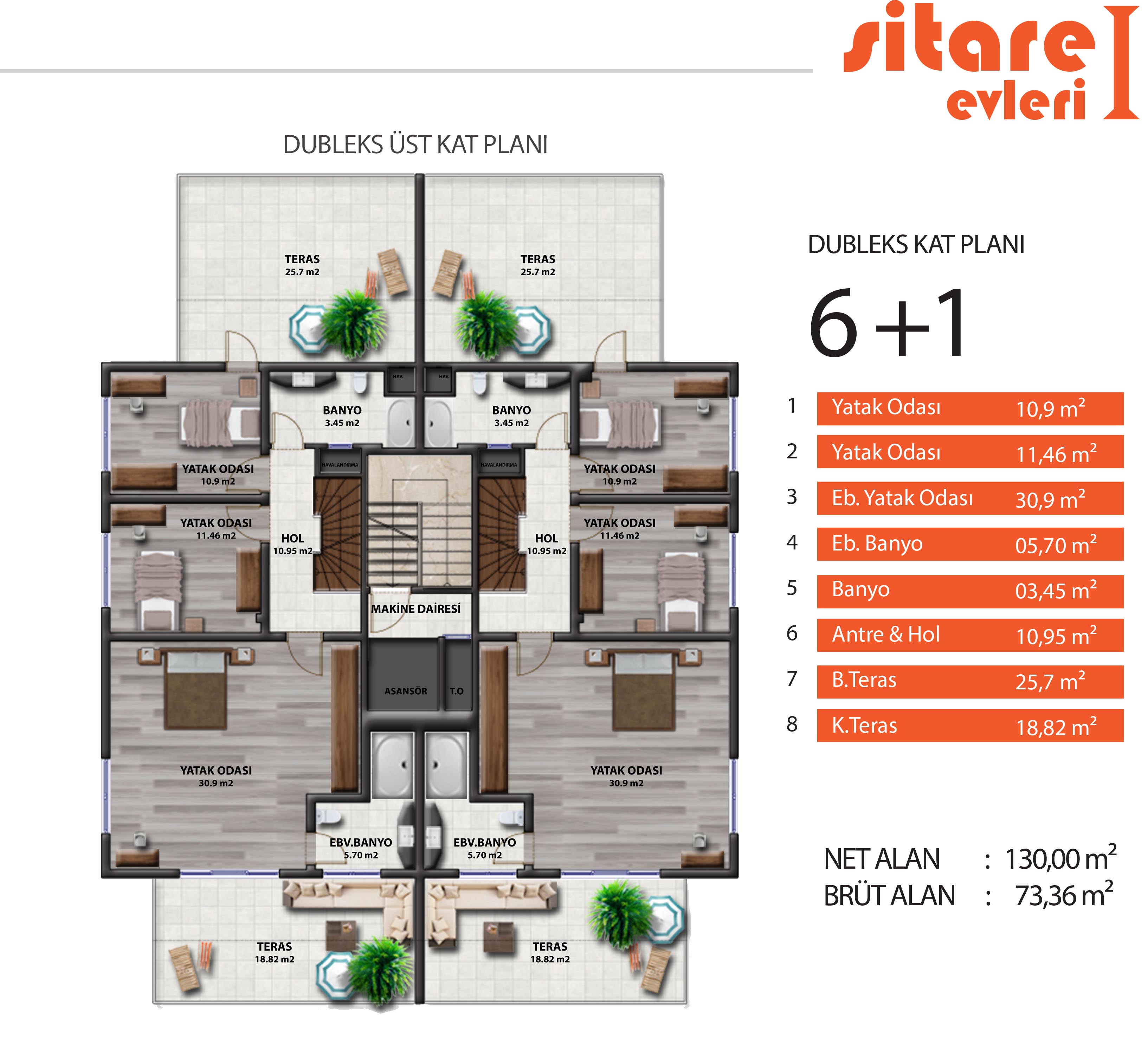 Zeminler 1. sınıf BİEN veya ÇANAKKALE marka kalebodur olacaktır. Duvarlar alçı üzeri su bazlı saten boya olacaktır. Mutfak dolapları projesine uygun DF lam olup tezgah granit olacaktır. Tavanlar alçı sıva üzeri su bazlı tavan boyası olacaktır.